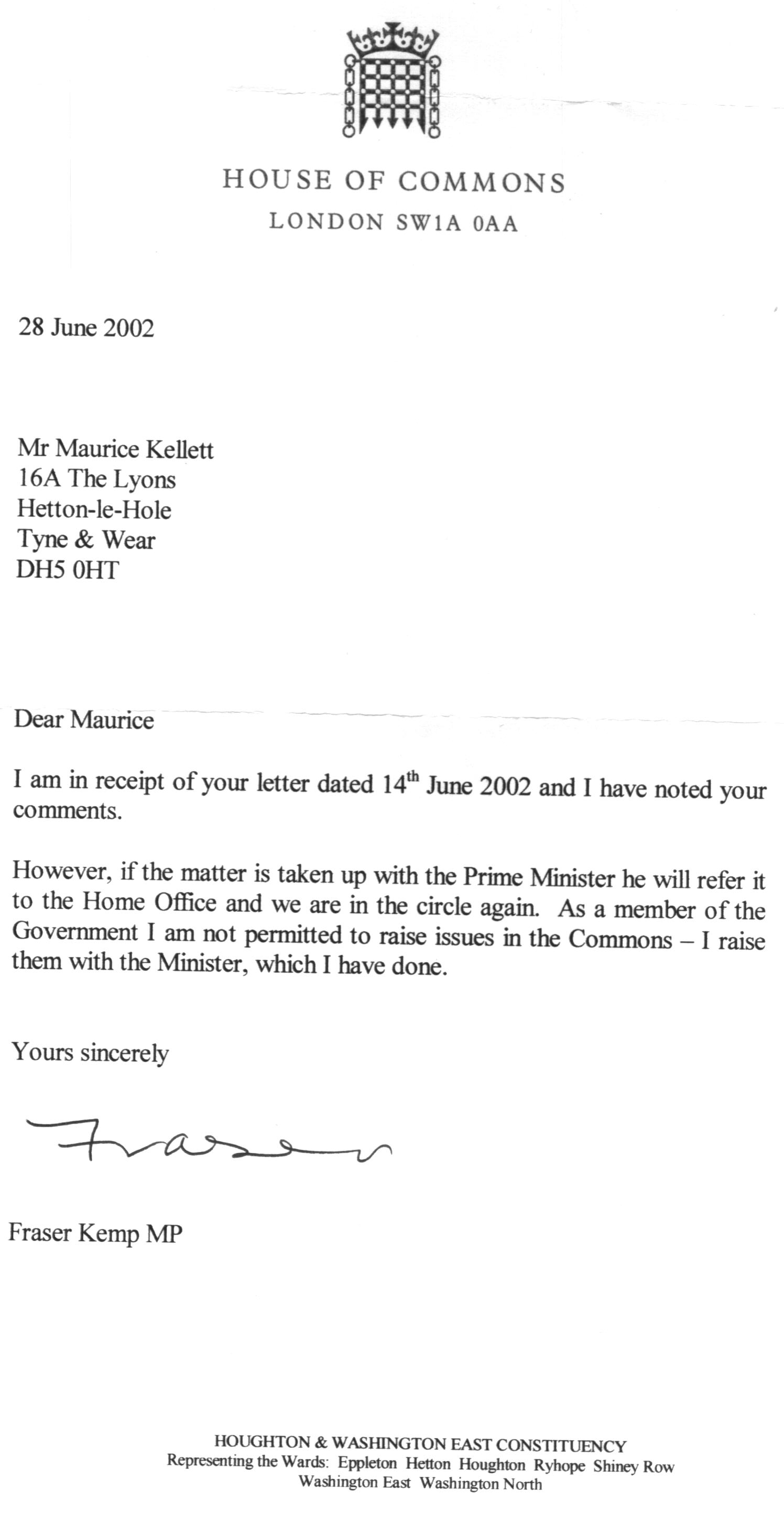 Below is copied the contents of my letter of the 14th June 2002along with the reply received to it from MP Mr Fraser Kemp dated the 28th of June 2002. An appropriate reply to it is presently being prepared.