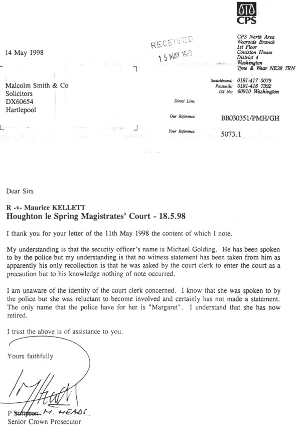 There follows here the letter which has just came to light dated 14th March 1998 which both solicitors A.N. Jackson of A.N. Jackson & Co Hartlepool, Co. Cleveland & Horden Co. Durham and C. D. Hughes of Harding Swinburne Jackson & Co., 58 Frederick St. City of Sunderland suppressed as evidence. On the day this letter relates to, Carr, a National Insurance Inspector, had falsely alleged that I had approached and threatened her at the Sunderland County Court. The letter is evidence that I had not approached and threatened her, but as is her normal practice, she had lied in that matter as well. Of other relevance, both Northumbria Police and the Washington Crown Prosecution had this information. Why in these circumstances did they proceed with a case against me alleging as part of it that I had approached and threatened Carr in the Sunderland County Court? There is only one answer that I can offer and that is they are both parts of our many corrupt authorities. There is even more evidence than this available.